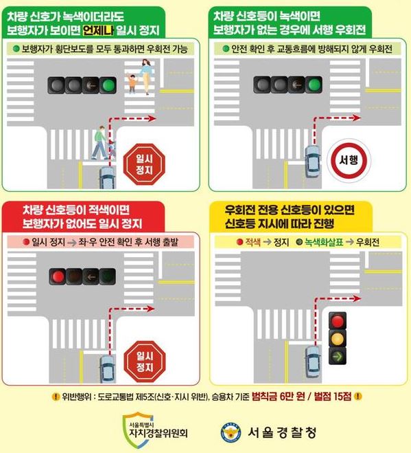 - 차량신호가 녹색이면 보행자가 없는 경우 서행하며 우회전하면 됩니다.